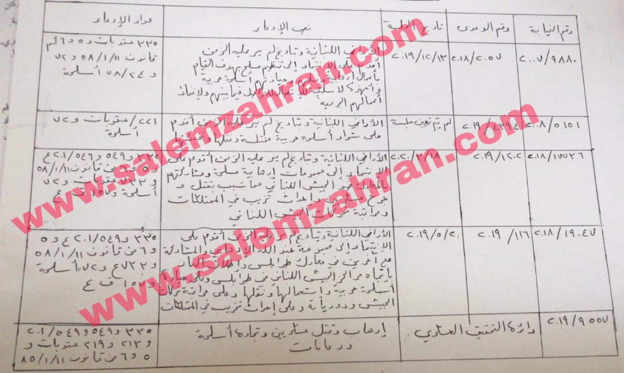 كشف مدير مركز الإرتكاز الإعلامي سالم زهران بالتواريخ والتفاصيل جدولاً يتضمن المسار القضائي الكامل للإرهابي كنعان ناجي وغرد على صفحته على تويتر قائلاً: "كل الحذر من تلميع صورة كنعان ناجي تمهيداً لإطلاق سراحه، وهذا جدول مفصل بخمس دعاوى قضائية بتهم إرهابية شتى منها قتل عسكريين".
