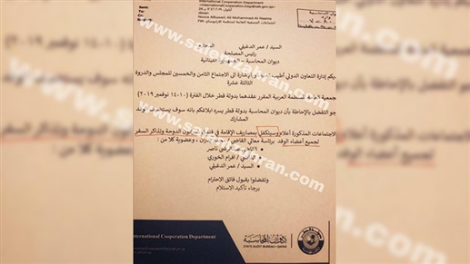 والمراسلة الثانية هي من ديوان المحاسبة في دولة قطر إلى ديوان المحاسبة في لبنان تتضمن تكفلاً بكافة مصاريف مشاركة أعضاء الوفد اللبناني في الإجتماع الثامن والخمسين للمجلس التنفيذي والدورة الثالثة عشرة للجمعية العامة للمنظمة العربية في قطر بين 10 و14 تشرين الأول ٢٠١٩.